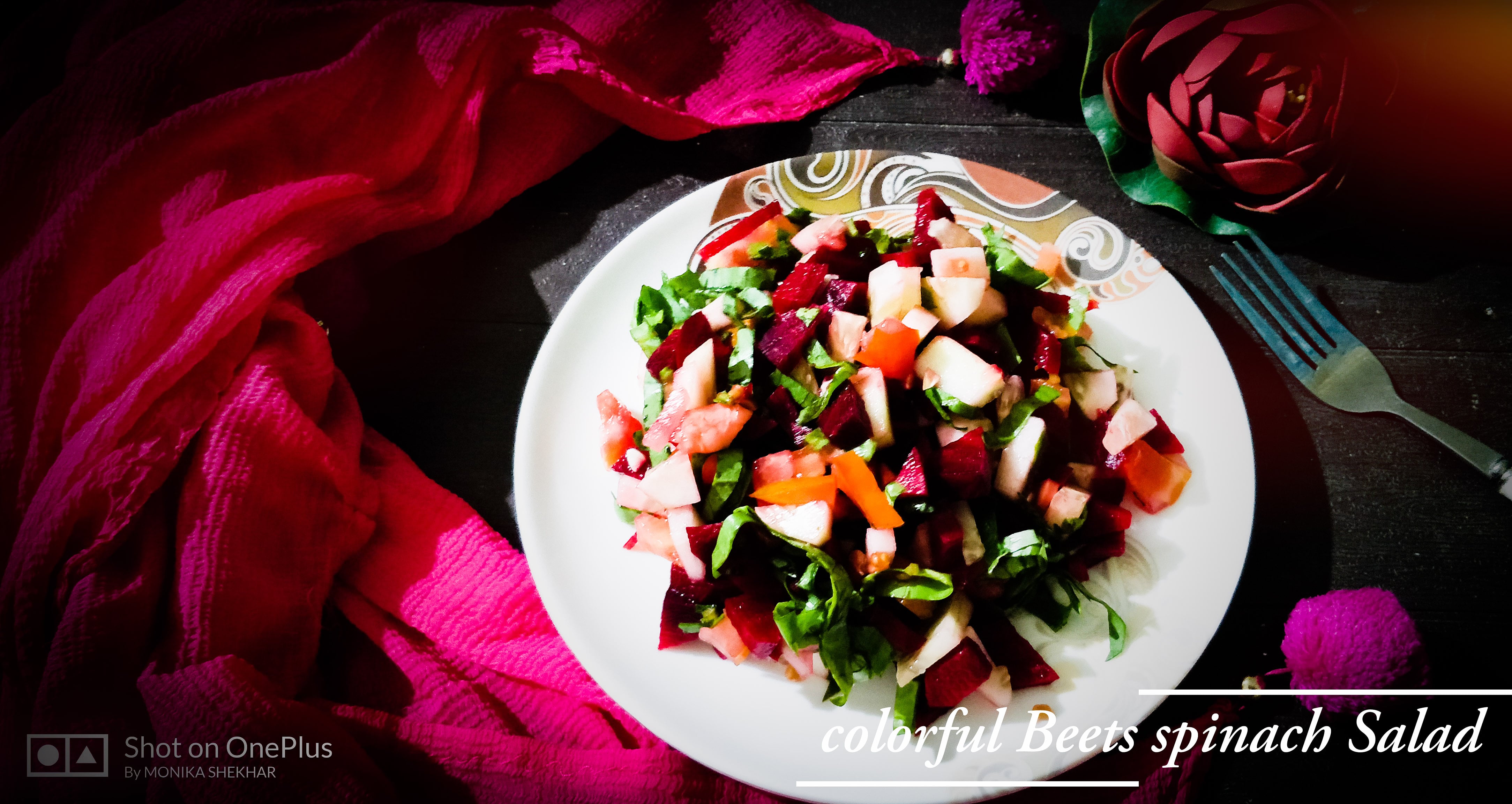 Beets,the deep purple roots are eaten either raw or cooked,alone or combined with other veggies.The green leafy portion of the beets too is edible and can be added to some salads.When combined with other raw veggies like spinach, tomatoes, cucumber can be eaten as winter salad.It serves as a low calorie,high fibre,gluten free vegetarian diet that helps in boosting immunity and sounds nutritious for healthy pregnancy.Spinach has green goodness and beets have earthy flavours that brings colors and comfort to the dining table.